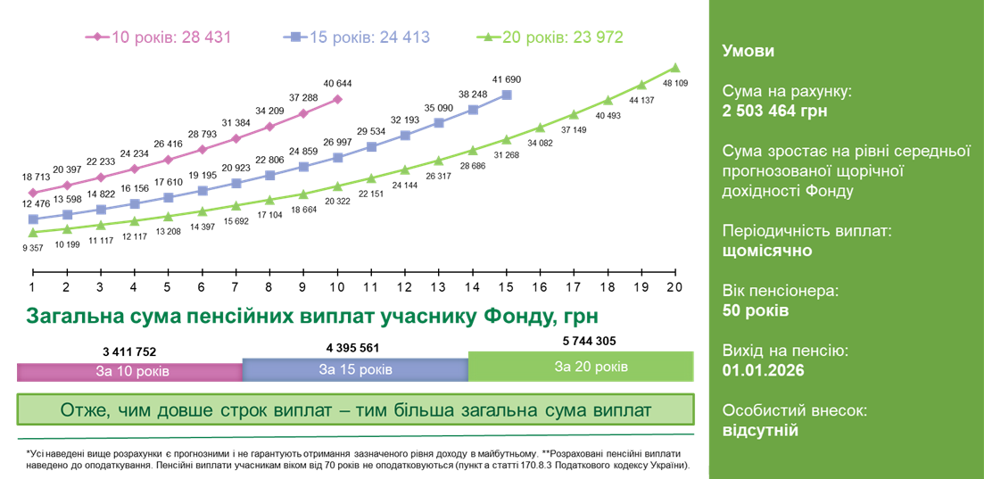Учасники Фонду-майбутні пенсіонери при укладенні договору про виплату пенсії на визначений строк, визначаються з періодом, протягом якого вони будуть отримувати свої накопичення (10, 15 або 20 років).