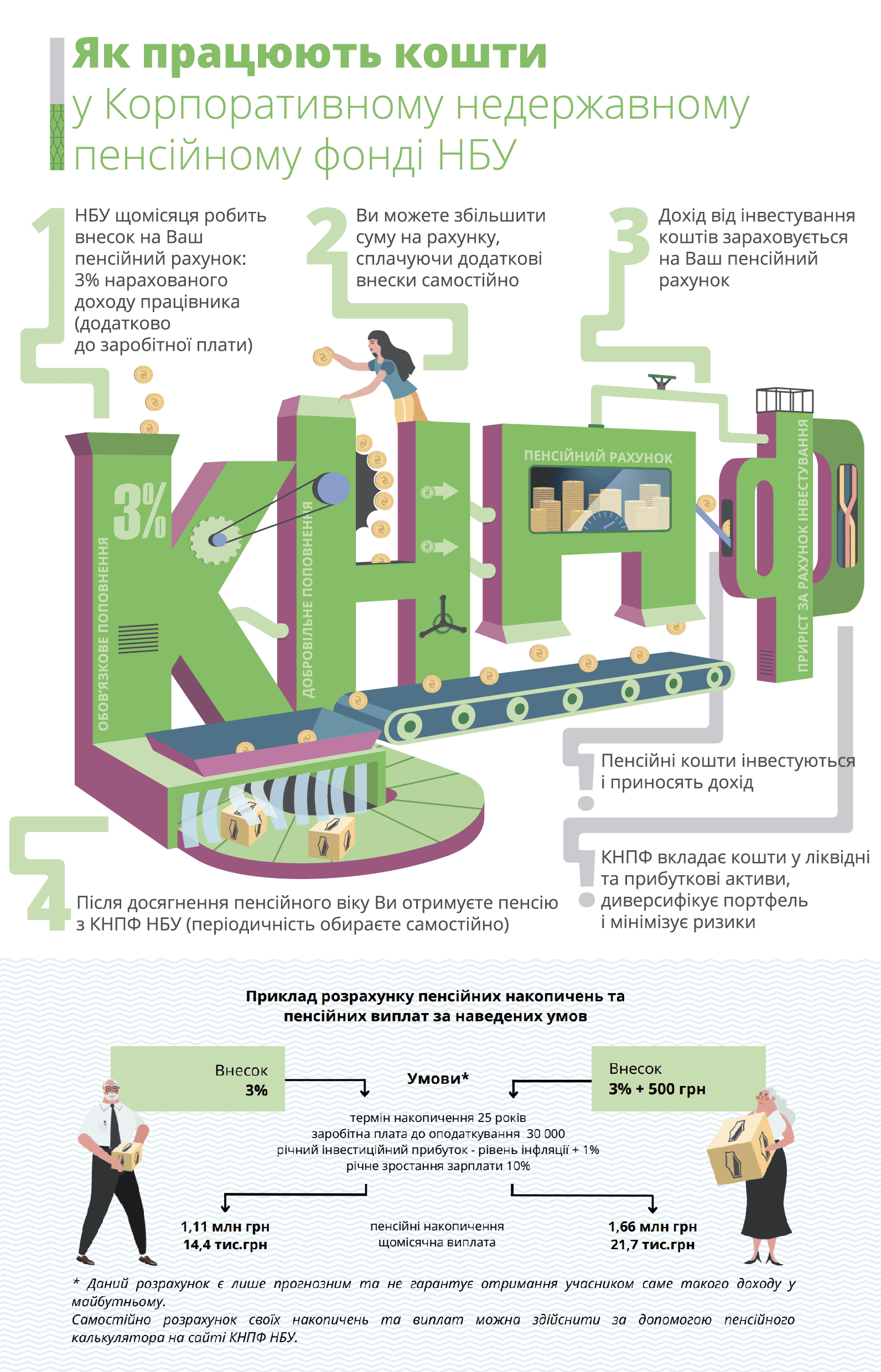 Пенсійні накопичення на Вашому персональному рахунку у КНПФ НБУ складаються з пенсійних внесків та результатів діяльності від інвестування
